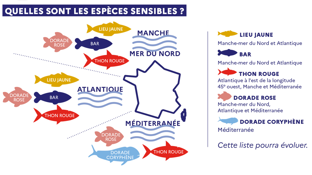 Tous les pêcheurs âgés de 16 ans et plus, lorsqu’ils cherchent à capturer l’une des espèces sensibles listées (bar, lieu jaune, thon rouge, dorade rose, dorade coryphène selon façade maritime).