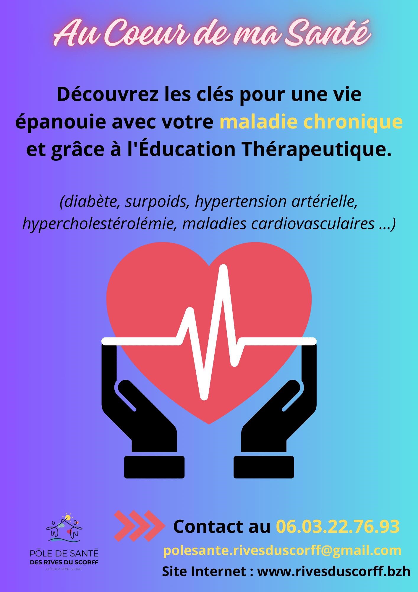Conférence santé. Des ateliers santé gratuits destiné aux personnes concernées par une maladie chronique (diabète, surpoids, hypertension artérielle, hypercholestérolémie, maladie cardio-vasculaire) animé par différents professionnels de santé. Mardi 2 juin de 10 h à 12 h , mardi 9 juin de 10 h à 12 h , mardi 16 juin de 10 h à 12 h , mardi 23 juin de 10 h à 12 h , mardi 30 juin de 10 h à 12 h, salle ADMR, 1, place Treano, Pont-Scorff. Gratuit. Réservation avant le lundi 25 mai. Contact : 06 03 22 76 93, assoprosante.pontscorff@gmail.com, www.rivesduscorff.bzh/actions-de-sante-publique/education-therapeutique-du-patient/au-coeur-de-ma-sante/.