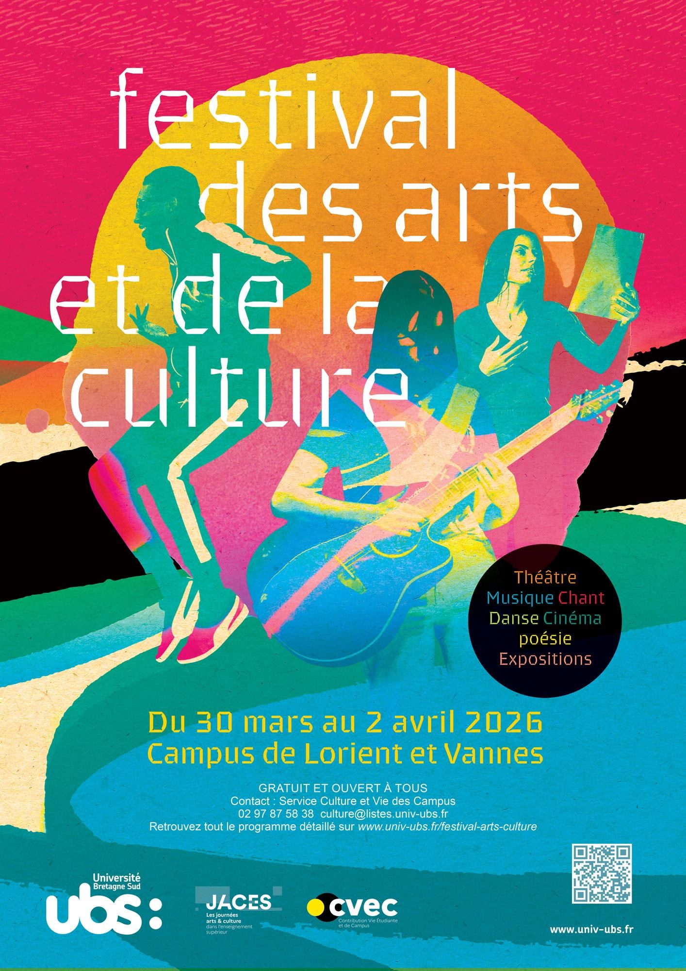 Festival. Du 30 mars au 3 avril, l'Université Bretagne Sud organise le Festival des arts et de la culture. Danse, théâtre, musique, cinéma, expositions et lectures rythmeront la semaine sur le campus de Lorient, dans la nouvelle salle sport-culture Le BlocK. Ouvert à tous. Du lundi 30 mars au jeudi 2 avril, Le BlocK, 7, rue des Montagnes, Lorient. Gratuit. Contact : 07 62 51 06 52, julie.kerguen@univ-ubs.fr, www.univ-ubs.fr/festival-arts-culture.