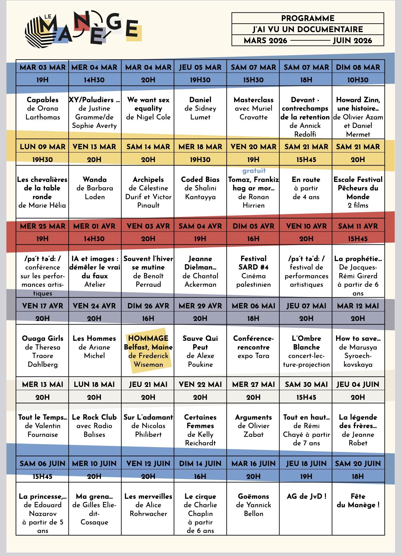 Ciné-débat. Le nouveau programme trimestriel du cinéma Le Manège est prêt avec 42 séances. Il est d'ores et déjà possible de le découvrir et de planifier ses soirées. Et nouveauté importante : l'ouverture de la nouvelle billetterie en ligne. Les réservations se font sur le site internet. Du dimanche 1er mars au mardi 30 juin, Cinéma Le Manège, 12, rue Colbert, Lorient. Tarif 7€, réduit 3€, Tarif adhérent 4€. Contact : 06 25 44 27 90, jvd.communication@gmail.com, jaivuundocumentaire.fr.