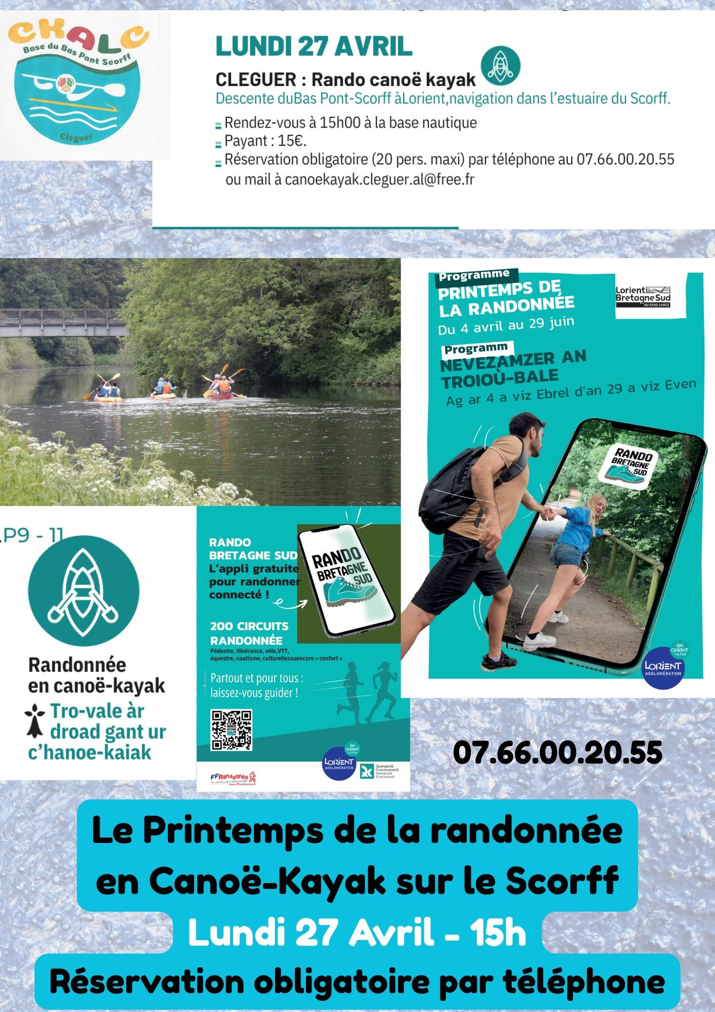 Nature. Pour le Printemps de la randonnée et en partenariat avec Lorient Agglomération, sortie en eau calme sur 10 km d'une durée de 2 h 30 environ, en autonomie. Inscription par téléphone obligatoire. Le tarif est réduit pour cette occasion. Nombre de places limité. Lundi 27 avril à 15 h, base nautique, 20, rue du Palud, Cléguer. Tarif 15€. Contact : 07 66 00 20 25, amicale-laique-cleguer.assoconnect.com/page/1000285-balade-sur-le-scorff-en-canoe-kayak.