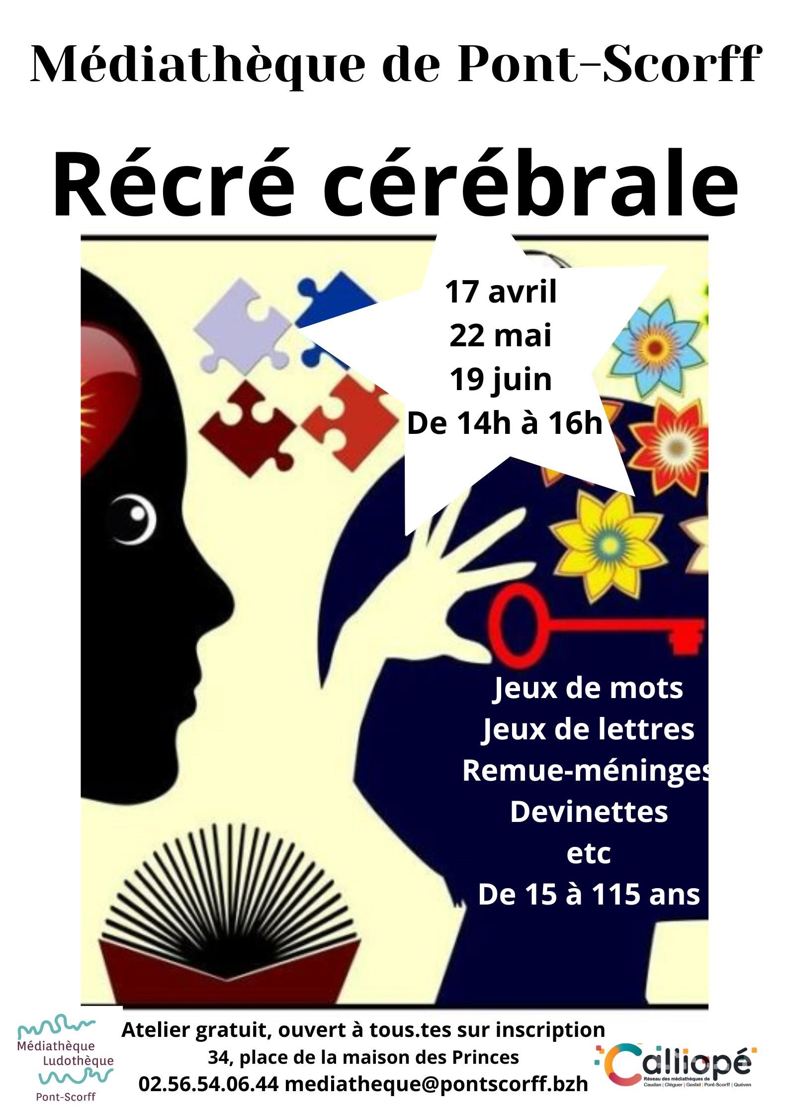 Dictée. Jeux de mots, jeux de lettres, remue-méninges, devinettes, dictées, etc. Animation menée par une bénévole de la médiathèque. Ouvert à tous, à partir de 15 ans, inscription conseillée. Vendredi 22 mai de 14 h à 16 h, médiathèque - ludothèque, 34, place de la Maison-des-Princes, Pont-Scorff. Gratuit. Contact : 02 56 54 06 44, mediatheque@pontscorff.bzh, calliope.bzh.