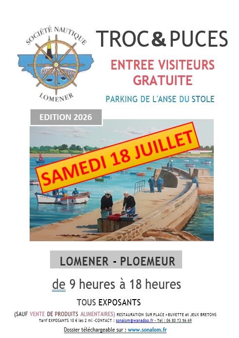Vide-greniers. 100 exposants. Le troc et puces sera suivi d'une Guinguette avec entrée gratuite et piste de danse et musiciens de 18 h à 23 h. Restauration et buvette sur place. Samedi 18 juillet de 9 h à 18 h, Lomener, 1 plage de l'Anse du Stole, Ploemeur. Tarif : tarif exposant pour 2 mètres d'exposition 10€. Contact : 06 80 73 56 69, sonalom@wanadoo.fr, www.sonalom.fr.