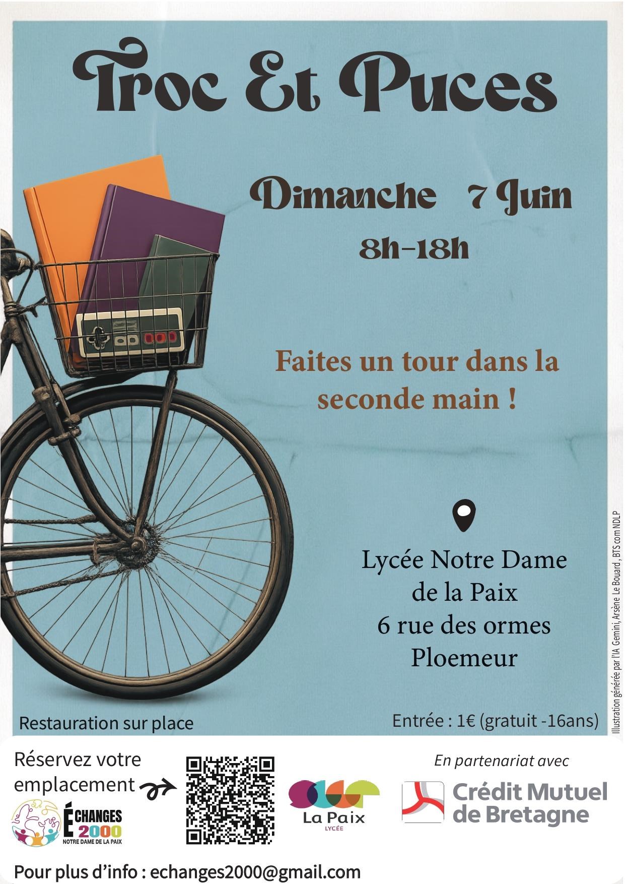 Vide-greniers. 100 exposants. Échanges 2000 au profit des élèves et étudiants du lycée Notre Dame de la Paix dans le cadre des actions pédagogiques. Restauration sur place. Dimanche 7 juin de 8 h à 18 h, lycée Notre-Dame-de-la-Paix, 6, rue des Ormes, Ploemeur. Tarif : Table 2 m extérieur couvert 10€, Table 2 m extérieur non couvert 8€, 1 ml sans table extérieur couvert 4€, 1 ml sans table extérieur non couvert 3€. Contact : echanges2000@gmail.com.